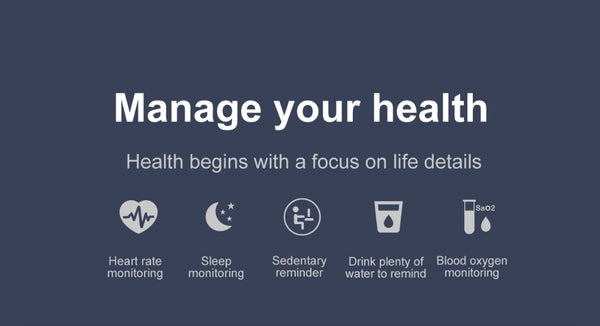 Function: Blood Pressure, Passometer, Sleep Tracker, Activity Tracker, Fitness Tracker, Heart Rate Tracker, Blood Oxygen, Social Media Notifications, Message Reminder